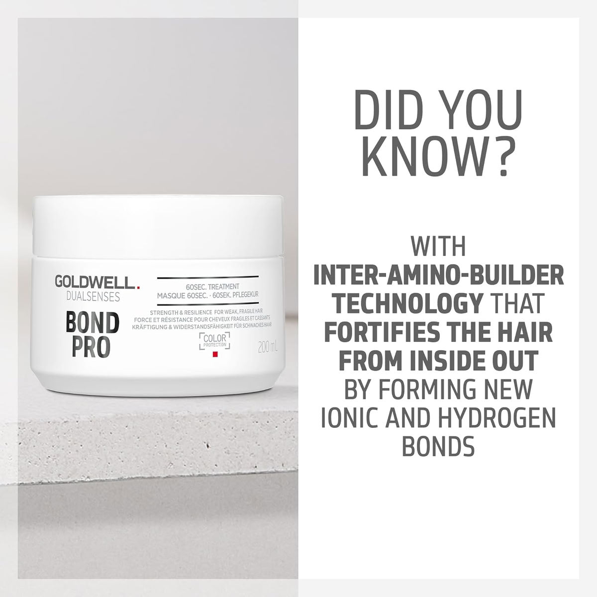 Goldwell Dualsenses Bond Pro 60Sec Treatment strengthens weak, fragile hair in just one minute while protecting against breakage and split ends. Formulated with Inter-Amino-Bond-Builder technology, it reinforces the inner hair structure, restores resilience, and leaves hair stronger, softer, and more manageable.