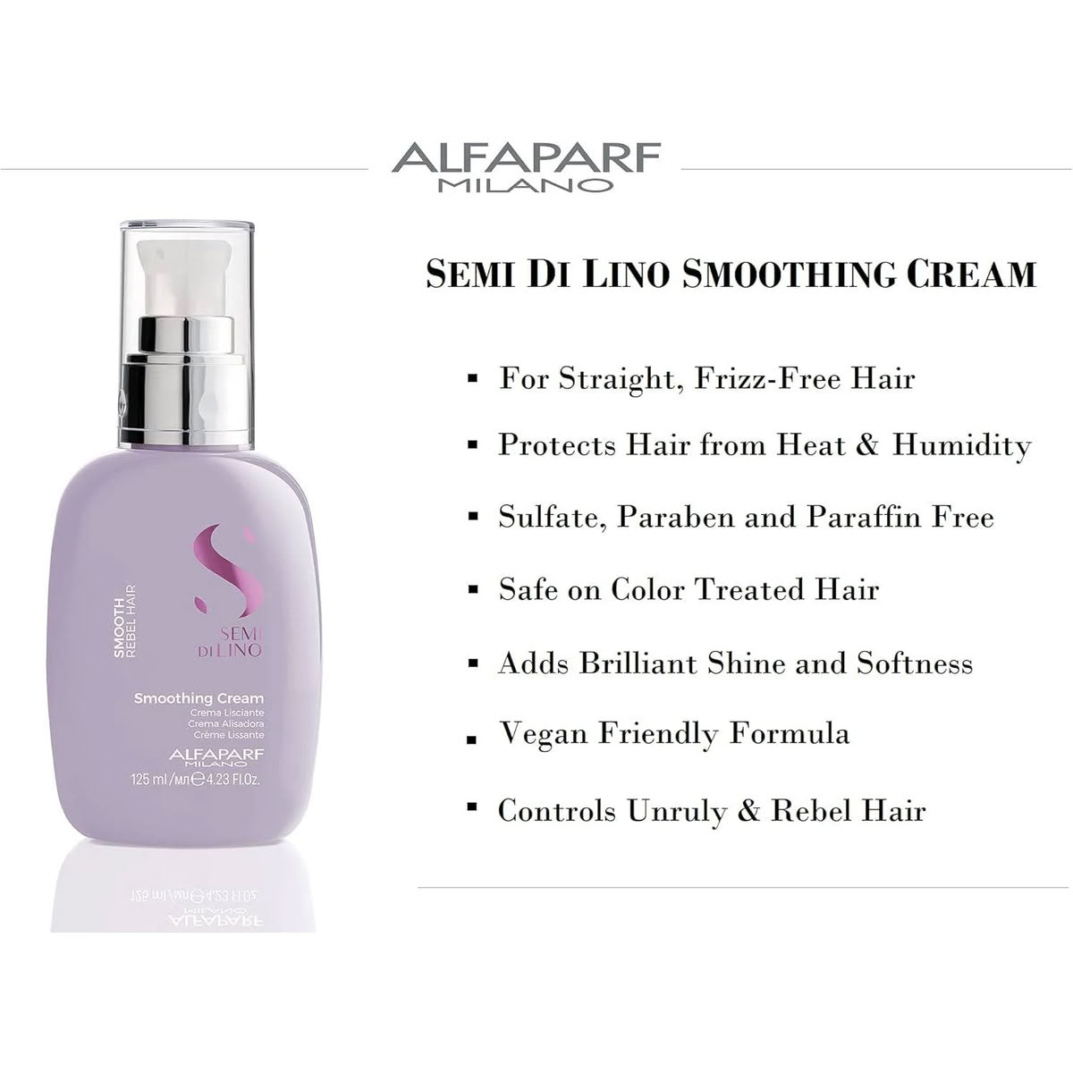 Alfaparf Milano Semi di Lino Smooth Cream is a lightweight smoothing leave-in treatment that helps control frizz and protect hair from heat and humidity. Enriched with flaxseed extract and shine-enhancing ingredients, it leaves hair soft, silky, and easy to style.